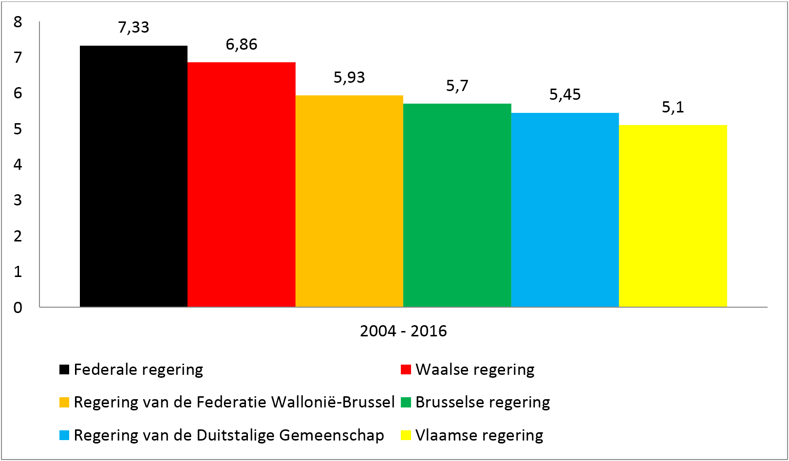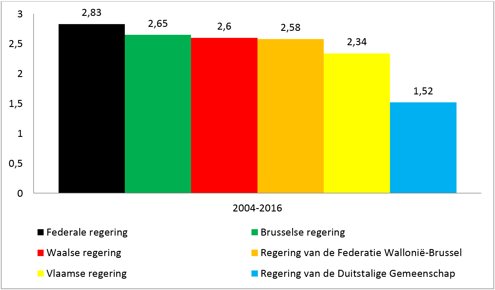 Op het niveau van de federale regering wordt het meest gecumuleerd. Dit geldt evenzeer voor alle mandaten zonder onderscheid als voor de bezoldigde of onbezoldigde mandaten. De Duitstalige regering is de beste leerling; haar leden cumuleren weinig bezoldigde mandaten (gemiddeld 1,52).