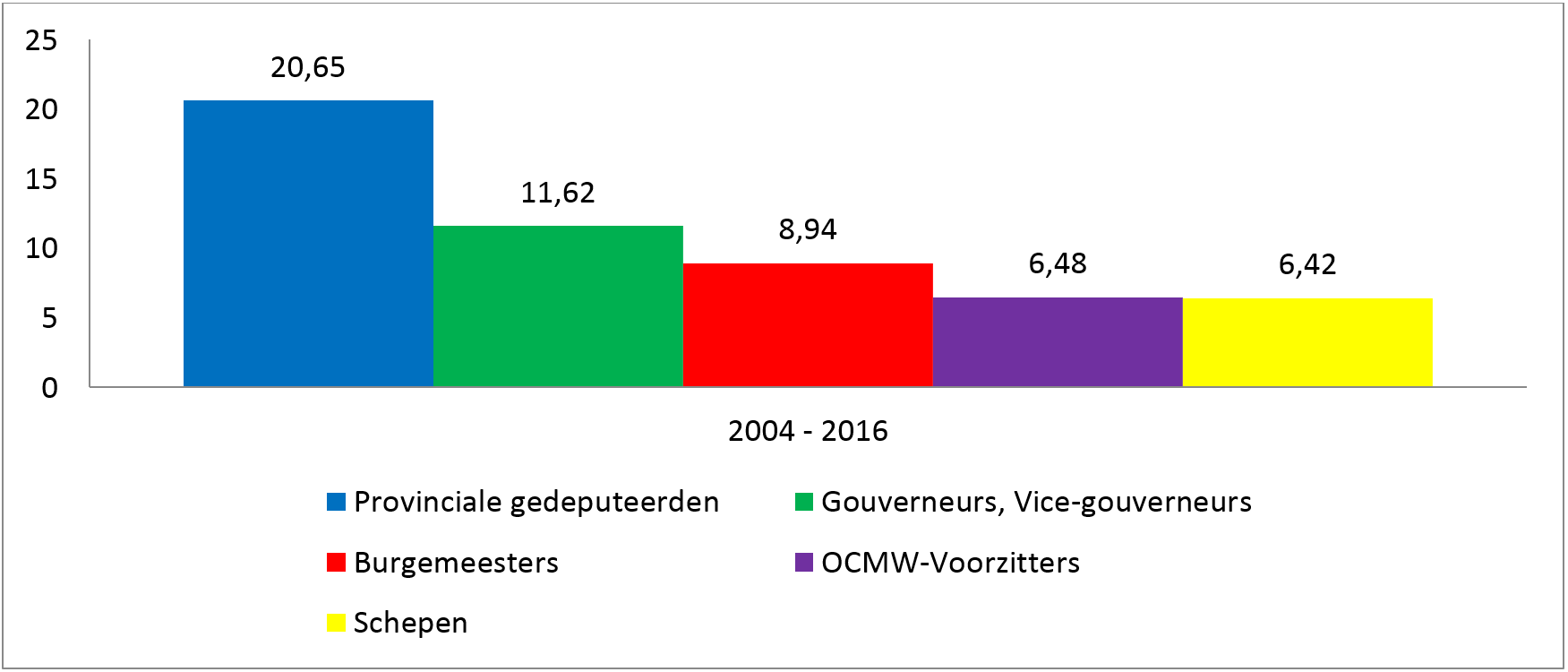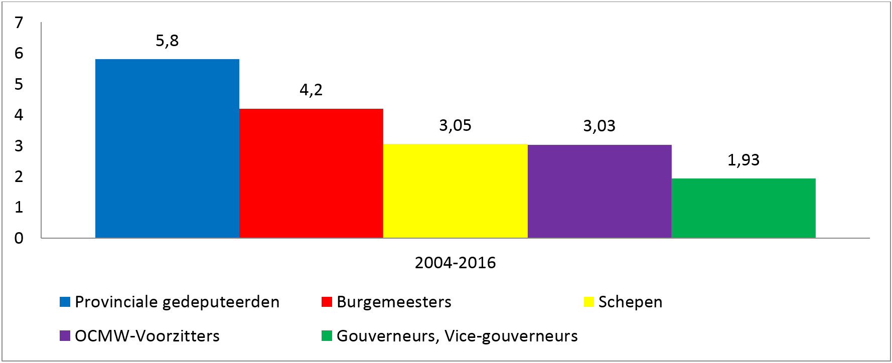 De burgemeesters cumuleren gemiddeld 8,94 mandaten (4,2 bezoldigd en 4,76 onbezoldigd) gevolgd door de schepenen met een gemiddelde van 6,42 mandaten (3,05 bezoldigd, 3,37 onbezoldigd).