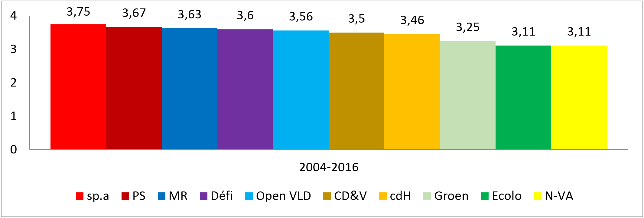 In de top 5 van de partijen die het meeste mandaten cumuleren vinden we 4 Franstalige partijen: PS, MR, cdH en DéFI. De sp.a vervolledigd dit klassement en staat op de 3e plaats. Dat betekent dat van de 10 partijen die in de studie opgenomen werden, slechts 1 Franstalige partij zich in de onderste helft van het klassement bevindt, namelijk Ecolo.